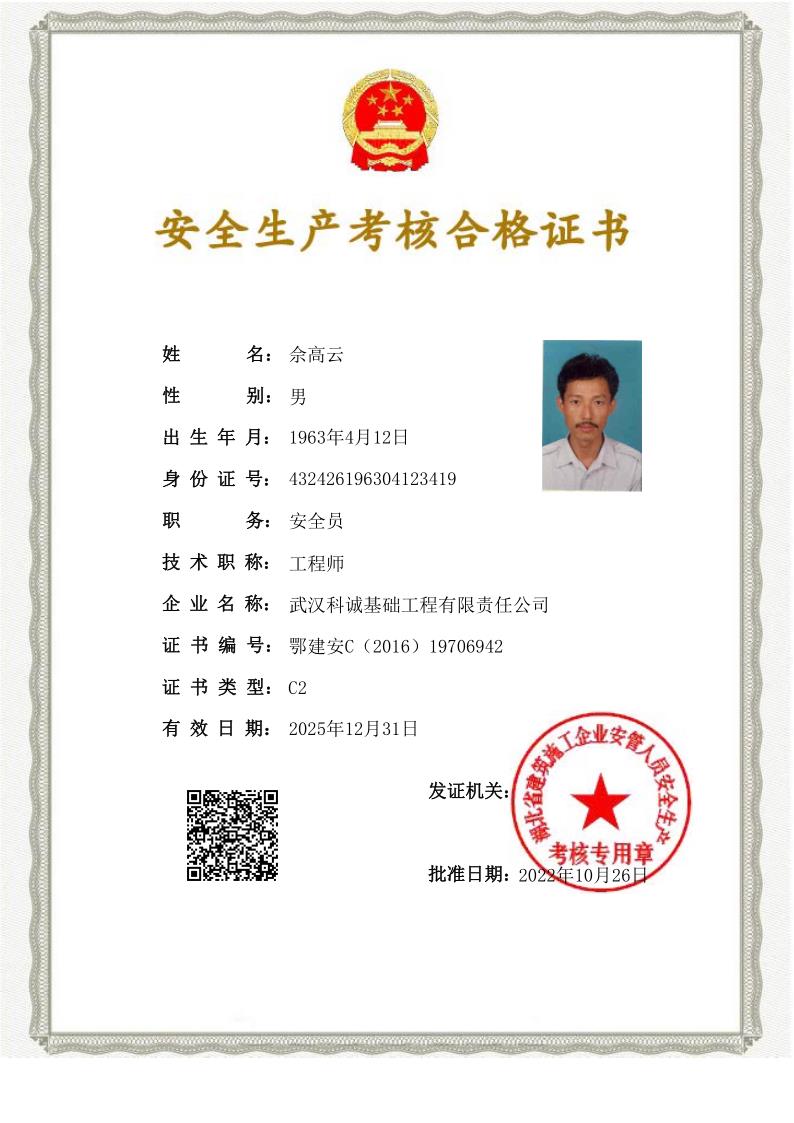 佘高云安全生产考核合格证书鄂建安C证
